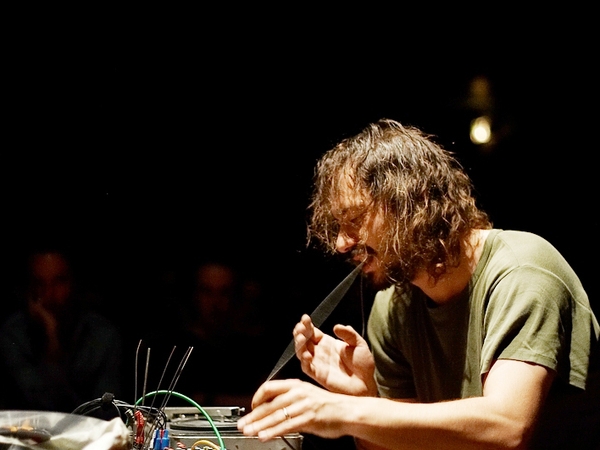 Il utilise principalement un dispositif électroacoustique rudimentaire construit autour d’un électrophone réparé (moult fois), d’une table de mixage préparée et de quelques micros/ capteurs : une électronique primitive où le geste est primordial.