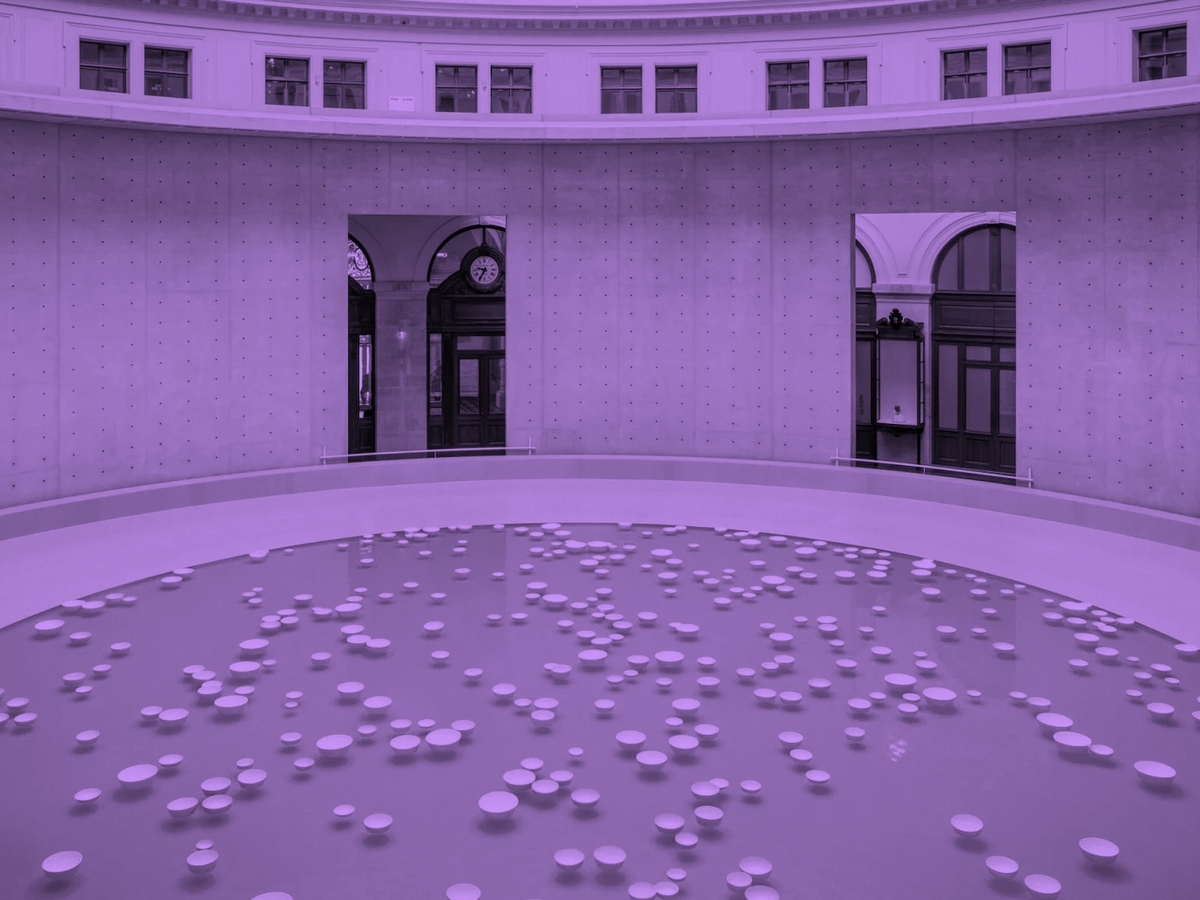 En écho à clinamen, œuvre aquatique et musicale de Céleste Boursier-Mougenot présentée dans la Rotonde de la Bourse de Commerce, Dedalus amplifie le temps d’une soirée la partition aléatoire de l’œuvre. Le titre clinamen, tiré de la physique épicurienne, fait référence à la trajectoire aléatoire des atomes en mouvement, un concept qui résonne avec l’aspect inévitablement changeant et imprédictible de l’œuvre de Céleste Boursier-Mougenot. Sur une étendue bleutée, des bols en porcelaine blanche, mis en mouvement par un léger courant, génèrent des sons mélodieux et incantatoires. Ces vibrations acoustiques, créées sans l’intervention d’un interprète, sont le cœur d’une véritable symphonie de l’instant, évoluant au gré de vagues invisibles. L’ensemble Dedalus y insuffle ses textures instrumentales.