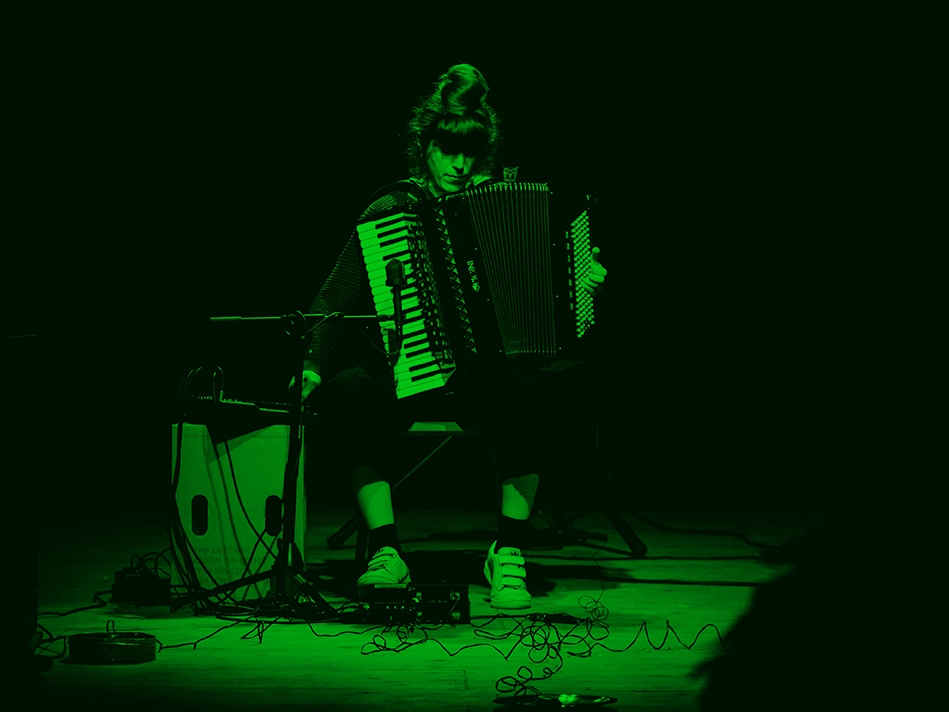 Emilie Škrijelj explore l’accordéon dans ses moindres plis et en use à la fois comme un instrument à percussion et un générateur de matières électroacoustiques. Inspirée par ses recherches autour de la platine, des synthé modulaires et du field recording, elle amène l’accordéon sur le territoire abstrait de l’électronique par la manipulation du soufflet, le frottage de ses contours et l’exploration de ses extrémités. Dans son solo Glitch, elle étend l’accordéon à l’aide d’objets de récupération pour développer un accordéon préparé en trois dimensions.